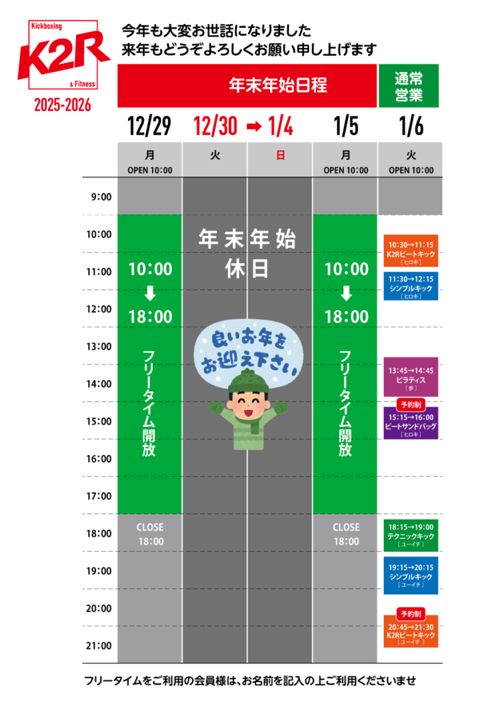 12月29(月)フリー解放(10:00〜18:00・レッスン無し)