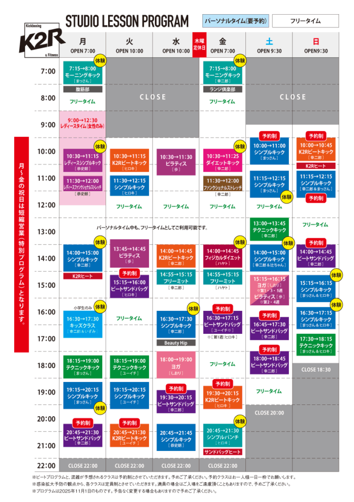 プログラムの(体験)マークが付いているクラスは、体験のご参加が可能です。K2Rのプログラムをお試し頂いた上でのご入会が可能です。下記のボタンよりお申し込みください。