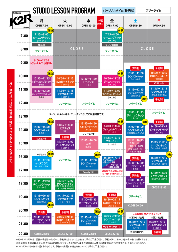 プログラムの(体験)マークが付いているクラスは、体験のご参加が可能です。K2Rのプログラムをお試し頂いた上でのご入会が可能です。下記のボタンよりお申し込みください。